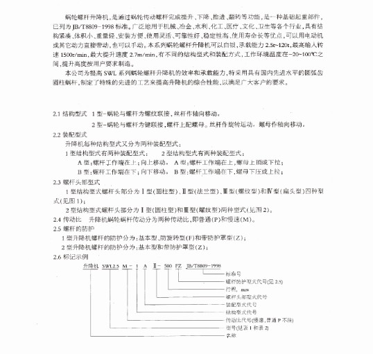 SWL蝸輪絲桿升降機是一種基礎起重部件,具有結構緊湊、體積小、重量輕、動力源廣泛、無噪音、安裝方便、使用靈活、功能多、配套形式多、可靠性高、使用壽命長等許多優點。SWL蝸輪絲桿升降機可以單臺或組合使用,能按一定程序準確地控制調整提升或推進的高度,可以用電動機或 其他動力直接帶動,也可以手動。SWL蝸輪絲桿升降機有不同的結構形式和裝配形式,且提升高度可按用戶的要求定制,該裝置可以自鎖。